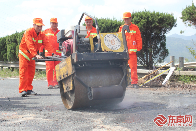 养护人员高速上修补坑槽。林凡 供图 清晨5点多,趁着太阳还在睡懒觉,郑子尧已经麻利的起身,穿戴好装备,准备开始一天的养护工作。 郑子尧是高速公路养护维修组的一名工作人员,“遮阳帽、橙色长袖长衫、超大瓶的白开水,这是我们的‘标配’。”郑子尧说,在高速上施工作业少不了防晒、防暑,所以及时补充水分是非常必要的。 在养护现场,冒着热气的沥青混凝土从补路王机器里倾泻而下,周围的温度迅速升高,热腾腾的烟气弥漫在路面。郑子尧立即上前将沥青混凝土均匀摊铺在坑槽里,在刚铺好的热料上推着压路机来回碾压成型。在烈日和高温沥青的双重“烤验”下,工人们早已汗流浃背,地面的热气透过鞋子把脚烤得生疼。