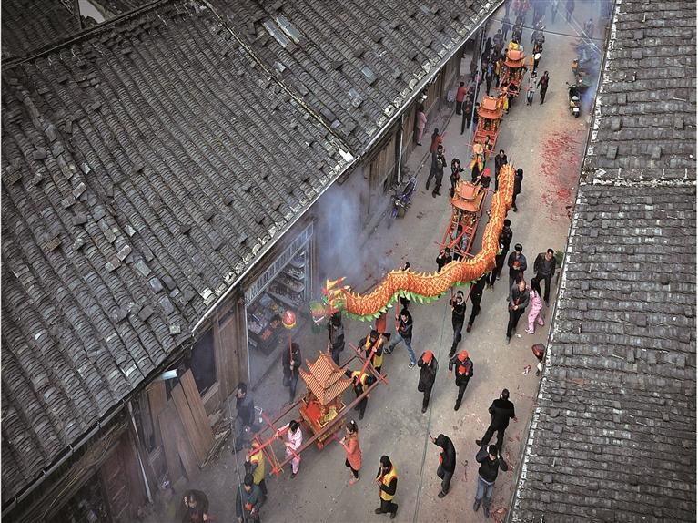 福安节庆舞龙习俗。 每年节庆,尤其是春节期间,是集中展示民间艺术的最好时机,从这个意义上可以说春节就是一年一度的民间艺术节。 民间艺术形式在这个全民性的节日里大显身手。此外,传统的“迎铁机”、“踏橇”、化装表演、“炒龙”等民间文化娱乐活动也开展得热火朝天。 “迎铁机”和“踏橇”在明朝就有,旧县志记载的“上元日诸境为橇马、铁机之戏”所指即是。“迎铁机”是旧县志所载“迎春妆台阁”活动的俗称。表演前要将儿童装扮成古装戏人物的扮相,根据故事情节,做出动作造型,固定在专门的铁制高架上,铁架固定在一个基座上,由数名力汉抬扛着游行;鼓乐伴奏,观众相随,前簇后拥,热闹极了。与“迎铁机”相似的还有“驮古事”,这种文娱活动明末清初就有。根据古装戏的故事情节,由几名小孩装扮成古典人物,然后“驮”在大人肩上,敲锣打鼓,游行表演。“迎铁机”和“驮古事”最常表演“西游记”“白蛇传”“三国”“水浒”“梁祝”等故事中的人物。 “踏橇”也叫“踩高跷”。表演者将钉有托板的木制“高跷”绑在小腿上,扮演古装戏角色,边舞边歌边游行。“高跷”一般长度为1.5米,技术好的表演者也有用更长的。“高跷”常与“迎铁机”联合表演。 化装表演源于古老的“跳傩”。明万历二十五年的《福安县志》就有“腊后,傩逐疫”的记载。用跳傩舞来驱瘟逐疫原是古代先民的一种无奈,后来衍为习俗。这一古老习俗现在已经消失,但作为一种“文化”却积淀了下来,取而代之的就是类似跳傩的化装表演。这种表演很简单,就是将一个画着滑稽脸谱的大头套套在头上,头套可以做成各种样式,头套的“眼睛”开着小孔供表演者看路;表演者边走边舞,做出各种动作,十分滑稽。化装表演也常与“迎铁机”“踏橇”为伍,“三合一”游行。 农耕时代人们对风调雨顺怀着极大的向往,从而想象出许多“龙”来。福安四境各有一条“龙”:东面靠近霞浦县境,有赤溪木龙;西向与周宁相邻,有象地鼓龙;南方和宁德交界,有官井革龙;北边与柘荣和浙江泰顺接壤,有沙坑沙龙。人们对这些“龙”又敬又畏,所以就有了“炒龙”习俗。炒龙又叫“舞龙灯”,这项活动在福安有悠久的历史。究竟是指望“巴结”这些龙公,把它们请出来乐一乐,以便祈求它赐福保平安,还是为了戏耍戏耍这些平日里作威作福、为所欲为的龙公,抑或兼而有之?这些最初的游戏目的都已经不重要了,留存下来的是代代相传的文化现象、切切实实的娱乐行为,并为节日和喜庆增添气氛。 福安人炒龙与闽东其他地方基本上相同:龙珠引路,首尾相顾,腾挪游行,起伏有致。每年正月,各路龙公豪兴勃发,乡民舞着长龙,过村串巷,走家钻铺,龙头舞进,龙尾退出;所到之处,鼓乐相随,接福迎祥,驱瘟去邪,为乡亲们讨来无限的吉祥。(闽东日报 李健民 文/图) |