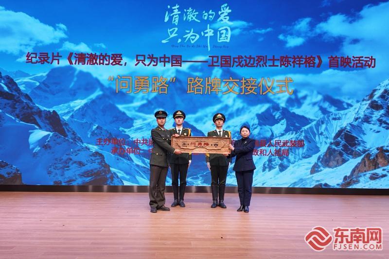 “问勇路”路牌交接仪式。东南网记者 叶伏国 摄 在首映仪式上,举行了“问勇路”路牌交接仪式,来自新疆和田县问勇仪仗队带着当地人民的深情厚谊,将意义非凡的“问勇路”路牌送至英雄故乡。让“问勇”精神在屏南大地落地生根,成为跨越地域的精神共鸣。当天,屏南县在烈士陵园组织开展缅怀纪念活动,来自新疆维吾尔自治区和田县的问勇国旗护卫队还在屏南县祥榕中学举行了庄严的升旗仪式。