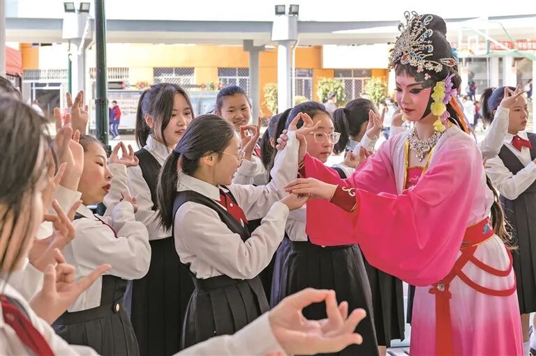 北路戏走进寿宁鳌阳中学,让学生们零距离感受国家级非遗的魅力。王志凌 摄 10年来,只要没有演出安排,每逢周四和周六,陈芳都会风雨无阻来到寿宁县实验小学北路戏社团,教授北路戏。“我们和学校联合,将对北路戏感兴趣的学生引入学校社团。低年级学生通过学练基本功‘发现戏曲之美’,中高年级学生排练折子戏‘触摸戏曲之韵’。”陈芳介绍。 北路戏俗称福建乱弹、横哨戏,是明末清初传入福建的乱弹声腔与当地民间戏曲融合而成,至今已近400年的历史,曾流行于闽北、闽中及闽东等地。2006年,寿宁北路戏被列入第一批国家级非物质文化遗产名录,成为寿宁的“文化名片”之一。 “北路戏要延续下去,就需要不断有新鲜‘血液’注入。”寿宁县北路戏保护传承中心主任吴卫平介绍,近年来,中心秉持“从娃娃抓起”的传承理念,持续开展送戏进校园活动,先后与寿宁县实验小学、寿宁县鳌阳小学、寿宁县第一中学等城区9所学校合作,让少年学子感受北路戏之美,乐当“传承人”。 寿宁县实验小学是寿宁县北路戏保护传承中心“联姻”的第一个对象。安排学生进行北路戏基本功训练、组织学生观看北路戏专场演出、培植他们对北路戏的兴趣与热爱……在寿宁县实验小学,看戏、学戏已经成为深受欢迎的课后活动,参演北路戏的学生更成为“校园顶流”。 今年9月,寿宁县实验小学新一期北路戏社团网上报名开启仅一分钟,60多个名额就被“一扫而空”。 这“火爆”的场景令寿宁县实验小学社团指导老师陈静感慨不已。她至今记得,10年前,学校社团刚开办时,只有不到20名学生。这还是她和同事一个个做家长思想工作争取来的。“那时许多家长充满了顾虑,担心学戏会影响孩子的学业。但实践证明,学戏和学习不仅没有冲突,还能互相促进,一些学生在参加社团后变得更加开朗、自信、勤奋。”陈静说。 向下扎根,向上生长。在悠扬的戏曲声中,传统戏曲与校园学生实现了“双向奔赴”。 在北路戏发源地凤阳镇,该镇中小学在北路戏传承中心和凤阳民间北路戏剧团的支持下,开设北路戏兴趣班,激发青少年对家乡,对传统文化的热爱。 寿宁四中举办“校园文化艺术节暨北路戏进校园”文艺展演,让戏曲的新风吹进青春校园。 …… 如今,寿宁北路戏不再是“高居殿堂”的文化遗产,而成了流淌在少年血脉中的文化基因,是孩子眼中闪耀的文化自信。 戏曲之韵融入课堂 在寿宁县实验小学,例行的课间操也有了新“戏”份。随着《小小传承人》北路戏戏腔的响起,学生们随着韵律演绎着北路戏的经典动作、身段,举手投足间满满的“戏曲感”。