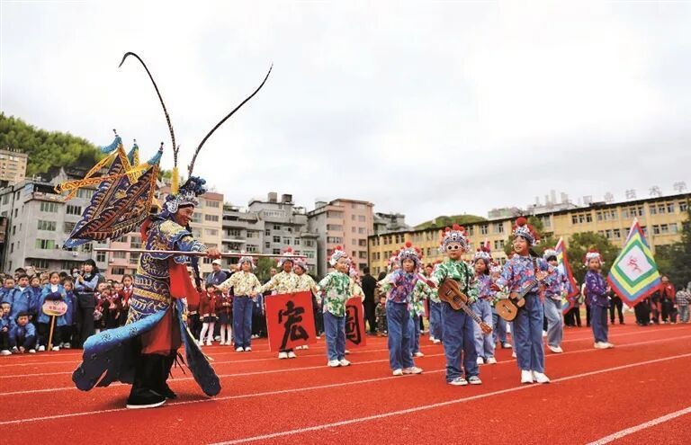 校园运动会上的戏曲表演。李洁琼 摄 台上一分钟,台下十年功。10年前,对于寿宁中小学生来说,对北路戏的认识多停留在耳濡,少有目染。而在如今的寿宁校园里,字正腔圆的戏腔已成为校园“新时尚”。 巨大的转变源于校园戏曲土壤的不断厚植。2015年,为了让北路戏艺术这一瑰宝在寿宁这片沃土上延续薪火、重焕光彩,寿宁县启动北路戏进校园行动,非遗传承的星星之火就此点燃。戏曲课程、戏曲社团、课外实践……丰富多样的形式,让青少年在欣赏中“入耳”、在体验中“入脑”、在参与中“入心”,为北路戏的传承与发展注入了新的活力与动力。 戏曲之花绽放校园 “步要稳,要学会运用眼神,做到眼中有戏……”近日,在寿宁县实验小学的社团课上,“小小传承人”们在寿宁县北路戏保护传承中心专业演员陈芳的指导下,进行北路戏的唱腔、手势、腿功、身段等基本功训练。孩子们举手投足中“戏味”十足,婉转动听的北路戏戏腔在校园内久久萦绕。