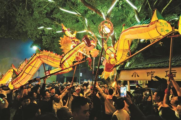 3月3日晚,蕉城区飞鸾镇碗窑村锣鼓喧天、人声鼎沸,宁德市级非遗“碗板龙”盛装巡游、腾跃起舞,以百米长龙的磅礴气势,点亮元宵佳节,为市民与游客献上一场兼具传统韵味与乡土气息的民俗盛宴。除了标志性的碗板龙,现场还有宁德市级非遗白眉青狮和铁枝民俗巡游展演。