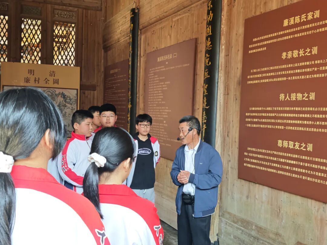 活动现场,廉村老书记陈木成在宗祠内为同学们生动讲述“开闽第一进士”薛令之的传奇人生——从灵谷草堂“男儿立志须稽古,莫厌灯前读书苦”的孤灯苦读,到及第后为官清正、甘守清贫的“苜蓿廉臣”风骨,再到御赐“廉村”“廉水”“廉岭”的千古佳话。陈木成老书记娓娓道来,将薛令之勤学成才、清廉自守、孝亲爱国的一生鲜活呈现在大家面前。 紧接着,陈木成老书记将话题引向家风家训的传承。他结合廉村丰富的“廉文化”故事、祠堂内蕴含的家风元素以及中华传统美德,深入浅出地阐释了“敬老孝亲、勤俭持家、诚实守信、励志勤学”的当代价值。