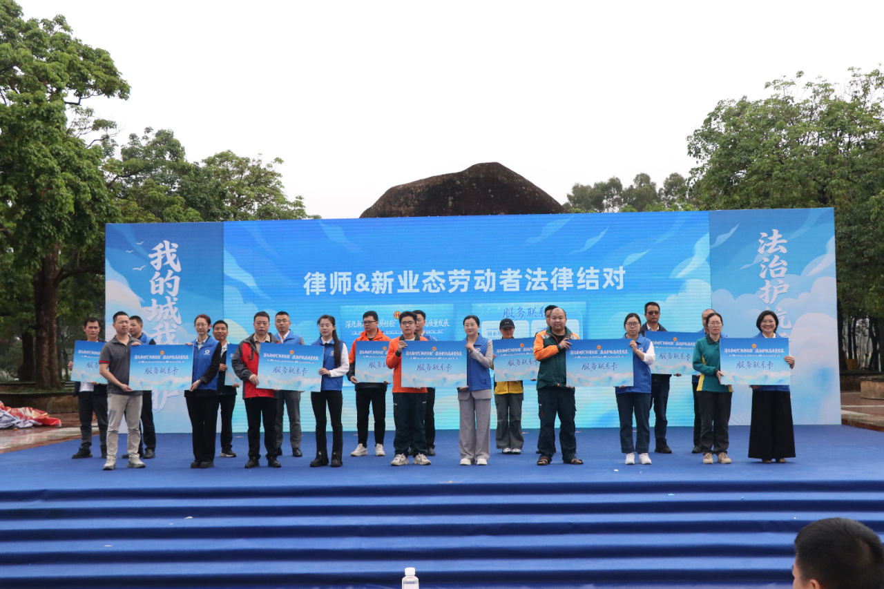 律师代表与新业态劳动者代表面对面互换《服务联系卡》。 启动仪式上,“宁德市律动先锋志愿服务队”正式授旗成立,为后续常态化开展新业态劳动者法治帮扶奠定坚实基础。随后,律师代表与新业态劳动者代表面对面互换《服务联系卡》,建立“一对一”法律结对关系,让每一位参与活动的新业态劳动者都能拥有专属法律“护航员”。期间穿插的快板表演《春风暖新业·法治护征程》更以朗朗上口的节奏、通俗易懂的语言,将劳动维权、社保保障等法治知识融入文艺表演,既传递了法治温度,也倡导了文明守法的新风尚。
