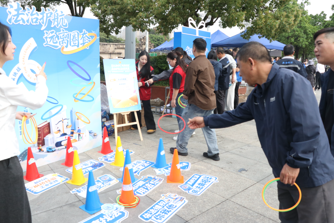 “法治套圈圈”互动游戏。 除了结对仪式,主办方还围绕新业态劳动者的实际需求,将普法宣传融入多个环节。现场播放的普法短视频聚焦交通事故理赔、平台用工争议等常见问题,律师以案释法、深入浅出地进行访谈解读。与此同时,主办方精心设计的“法治套圈圈”和“法律盲盒拆拆乐”吸引众多新业态劳动者驻足参与。这种“游戏+普法”的创新形式,打破了传统普法“单向灌输”的模式,让新业态劳动者在轻松愉悦的氛围中学习法律知识、提升维权意识,在寓教于乐中涵养法治文明。 “以前觉得法律离自己很远,都是生硬的条文,今天套个圈、拆个盲盒,不知不觉就记住了工伤怎么认定、劳动合同怎么签,既好玩又实用,真有意思!”一位刚参与完互动游戏的外卖骑手兴奋地分享着自己的收获。